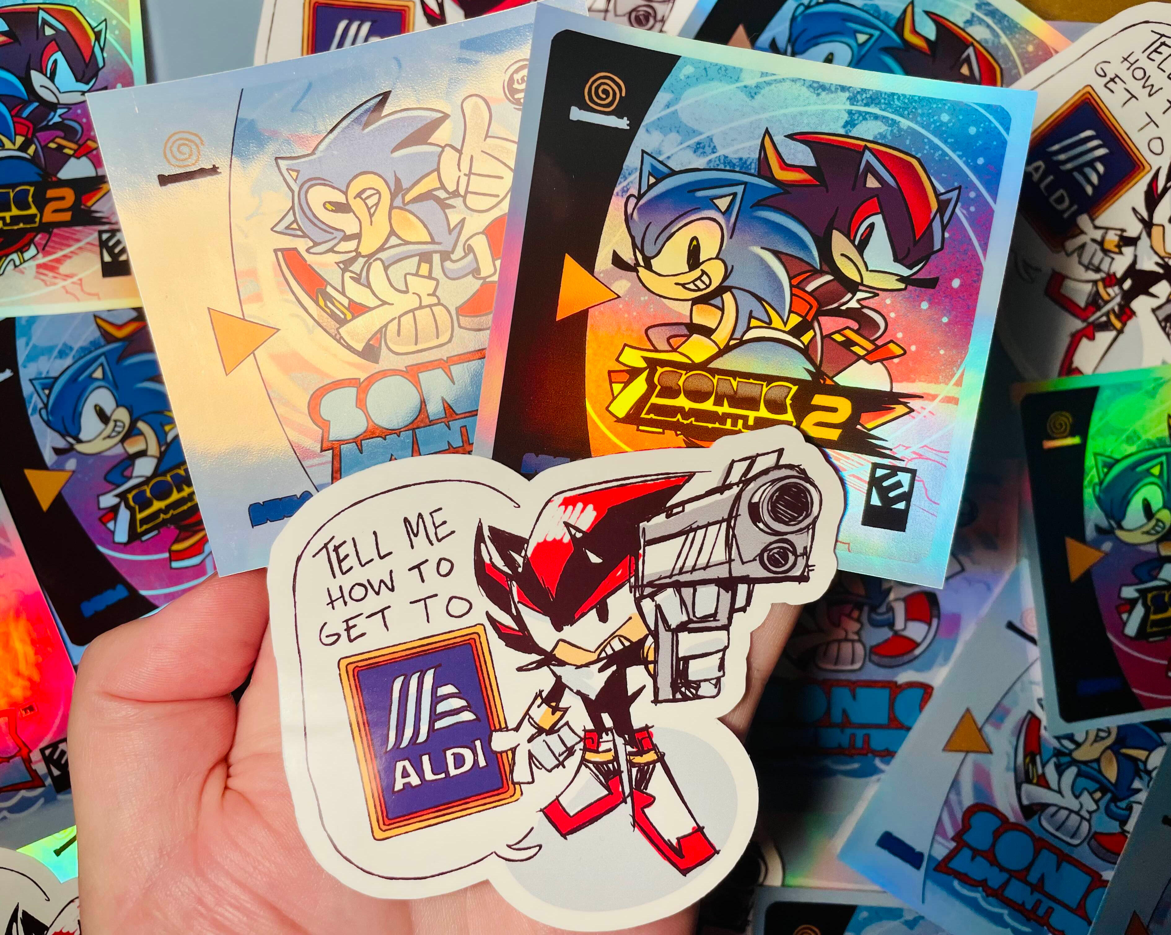 A selection of stickers, badges and keyrings and other merch I bring to events. All the stickers, sticker sheets and badges are produced by myself.